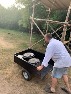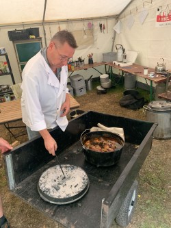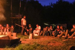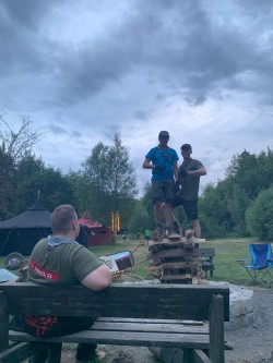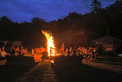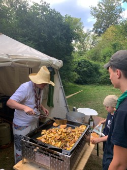 Zudem haben wir mit dem heutigen Sonntag auch die Mitte des Lagers erreicht und feiern somit unser Bergfest. Dafür wurde von ein paar starken Pfadfindern den Tag über Holz gesägt, geschnitten und gestapelt. Dank der vielen Arbeit gab es dann zur Lagerfeuerrunde ein Blockfeuer, das bestimmt 3 Meter hoch war.  Zur Feier des Tages darf natürlich auch das passende Essen nicht fehlen. Doch keine Angst das Küchenteam hat da noch was in petto. Über den gesamten Tag hinweg wurde mit viel Fürsorge ein Braten vorbereitet, an dem sich alle abends erfreuen konnten. Dazu gab es zudem Bratkartoffeln, Zwiebelsoße und Rotkraut. Mit dem Singen von Liedern um das Lagerfeuer ging dann auch der Abend zu Ende und wir können uns nun noch auf die letzte Woche freuen.