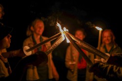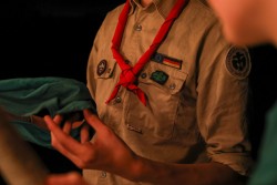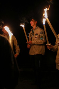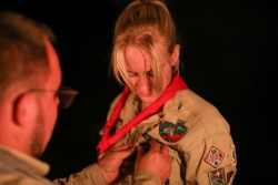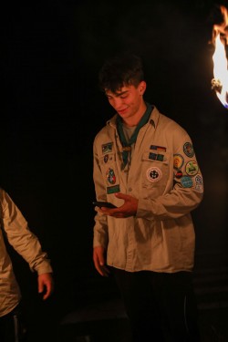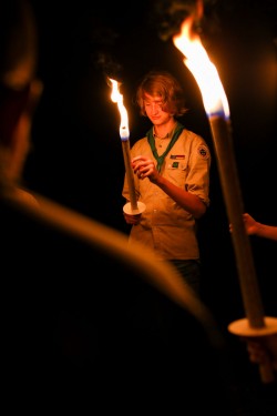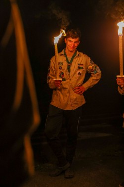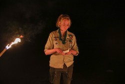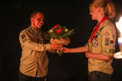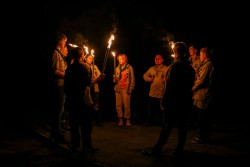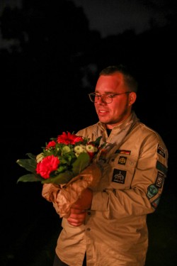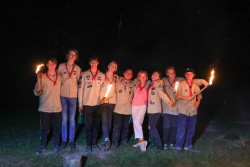 Über Klettern im kühlen Wald konnten sich die Rover freuen. Sie machten sich in einen nahegelegenen Klettergarten auf und verbrachten den Tag wie Tarzan schwingend zwischen den Bäumen. Im Anschluss ging es zur Erholung und Stärkung noch in ein Restaurant. Der besondere Teil für die Rover sollte jedoch noch kommen, denn für den Abend war das langersehnte Roverversprechen geplant. Ausgestattet mit Fackeln machten sie sich in der Dämmerung auf. Bei dieser emotionalen Veranstaltung ist nur die Gruppe selbst anwesend, sodass die Versprechenstexte intern bleiben. Zurück auf dem Platz konnten die Rover ihre neuen roten Halstücher präsentieren.