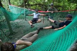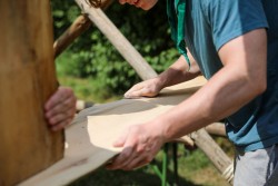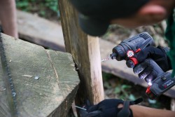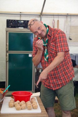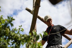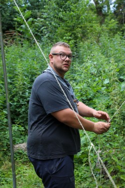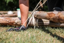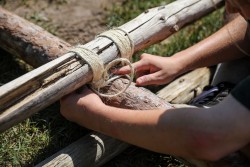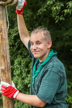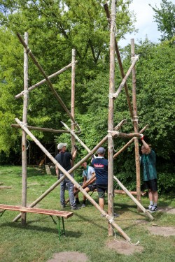 Die Gruppe hatte ein Ziel vor Augen: Der Bau eines Mutlifunktions-Hochstandes. Fahnenmast, Ausguck und Kiosk zugleich. Baumaterial: Holzstangen, Schnur und ein wenig Schrauben. Da diese Art von Lagerbaute für alle neu war, musste zunächst kurz gebrainstormed werden, was wie und wo wohl am besten funktionieren würde. Kurz überlegt und los ging das große Knoten. Vier Standfüße galt es zu verbinden, sodass daraus ein in sich versteiftes Konstrukt entstehen konnte. Über Kreuz verknotete Stangen sorgten für zusätzliche Stabilität.