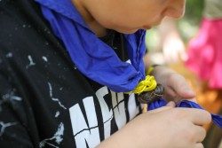 Mit voller Motivation wurde gefärbt und gebastelt. T-Shirts, große und kleine Taschen sowie Socken und sogar Unterhosen fanden in unseren Eimern neue Farbe. Mit Schnur und Gummibändern bewaffnet falteten, rollten und knüllten die Kinder ihre Stoffe. Nach einer Stunde im Farbeimer konnten die Kunststücke bereits zum Trocknen aufgehängt werden. Als Ergebnis entstanden wilde, neue und wunderschöne Muster, die die Kleidungsstücke einzigartig machen.