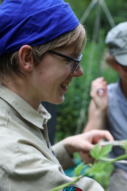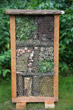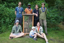 Insekten – zwar sind Zecken und Mücken lästig, doch die fleißigen Bienchen, die die Blumen bestäuben sind wichtig. Sie garantieren unser aller Leben und wir als Pfadfinder wollen sie dabei bestmöglich unterstützen. Was darf da also nicht fehlen? – Genau, ein Insektenhotel. Nach dem Eincremen mit Sonnencreme konnte es dann auch mit unserem Workshop losgehen. Angefangen mit der Planung. Es musste ein Gerüst her, das das Gewicht des Hotels tragen kann. Glücklicherweise haben wir schnell passende Bretter gefunden, die fast perfekt auf unsere Maße gepasst haben. Während die einen sich mit Schrauben und Akkuschrauber bewaffneten, schlugen die anderen sich in Büsche auf der Suche nach geeignetem Füllmaterial. Aufgeteilt in sechs Parzellen wurde das Insektenhotel mit Bambusstäben, Heu, Ästen und sogar leeren Schneckenhäusern befüllt, die die Kinder zuvor eifrig suchten und sammelten. Um zu sichern, dass nichts rausfällt und keine Vögel reingehen, wurden an die Vorder- und Rückseite noch zwei Schichten Hasendraht geschraubt. Anschließend wurde das fast fertige Hotel noch mit einem Dach und Standfüßen versehen. In voller Pracht steht das Insektenhotel nun hier und wartet auf seine neuen Bewohner. Zwar leisten wir damit nur einen kleinen Beitrag, doch jeder Beitrag zählt.