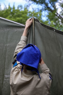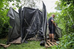 Da die Sanitäranlagen auf dem Zeltplatz leider unter unseren Erwartungen lagen musste eine Lösung her. Doch keine Angst, wir wissen uns zu helfen. Ratzfatz wurden mal eben zwei neue Duschen gebaut. Der Aufbau begann mit der Suche nach dem optimalen Stellplatz, bei dem die Lage perfekt für die Gegebenheiten passt. Den gefunden musste der Untergrund vorberietet werden. Paletten schienen die beste Option zu sein, um nicht im Matsch stehen zu müssen. Ringsherum wurden Planen aufgestellt, die den nötigen Sichtschutz in den Duschen liefern. Dafür musste die Gruppe kreativ werden und aus diversen Stangen und Hölzern eine Stütze bauen, an denen sie Planen aufgehängt wurden. Für Duscharmatur war – wie es so häufig ist – nicht alles vorhanden, sodass die Teilnehmer des Workshops sich auf eine dreistündige Jagd durch Baumarkt, Aldi, Apotheke und Edeka machten, auf der Suche nach dem passenden Gardenaschlauch.