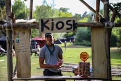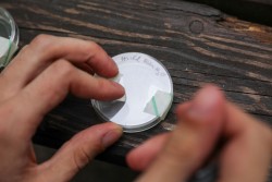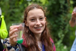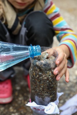 Neben den vielen Farben haben alle im Workshop auch etwas über Wasser gelernt. Dabei bauten sie aus verschiedenen Naturalien Naturfilter, um ihr Wasser zu reinigen. Grobe Steine, Kohle, Sand und Kiesel wurden aufgeschichtet. Gedeckelt wurde das Ganze mit einem Stück altem T-Shirt, durch das das Wasser geleitet wird. Das teilweise trübe Wasser aus dem nebenliegenden Fluss, den Leitungen auf dem Zeltplatz und unserem Trinkwasser wurde oben in die Apparatur eingeführt, sodass es durchsickern konnte. Bereits nach wenigen Sekunden war der Effekt schon sichtbar – klares, gefiltertes Wasser tropfte in die Flasche darunter. Um sicher zu gehen, wie effektiv der Filter ist, wurden Proben dreckigen Flusswassers und gefilterten Wassers und Petrischalen gesammelt und in den nächsten Tagen überprüft. Also schaut vorbei und überprüft selbst, ob es funktioniert hat.
